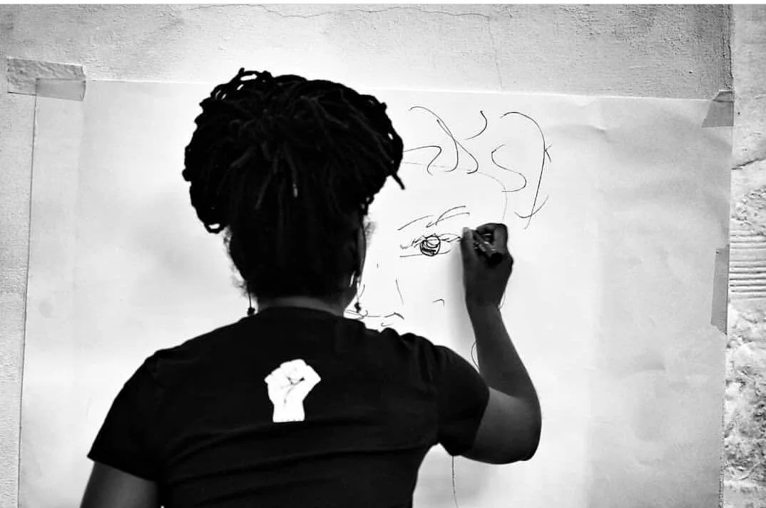 Stand Up for Africa is an event including Tuscany based artist, African refugees and young people from Casentino. The artist installative performance is a response to a series of workshops. The artist identifies the concept of humanity and its’ reaction to separation by choosing to specifically focus on the decay of humanity. This is depicted in the poem she carefully stenciled to a thin wooden board placed on the floor of the gallery. She acknowledges borders by the perceived concepts of black and white while attempting to eradicate them at the same time. She uses tedious and repetitive labor by scrubbing the line created from the contrast of the black and white painted on the board. The artist's interest in the interaction of the audience, her goal is always to evoke emotions pertaining to the human being and the way the human state it perceived.
